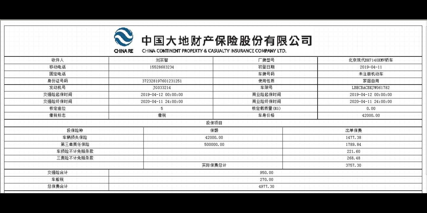 保險(xiǎn)金額4977.30元是4S發(fā)給我,讓我交錢的保單,另外2990.26元是保險(xiǎn)公司發(fā)給我的保單。