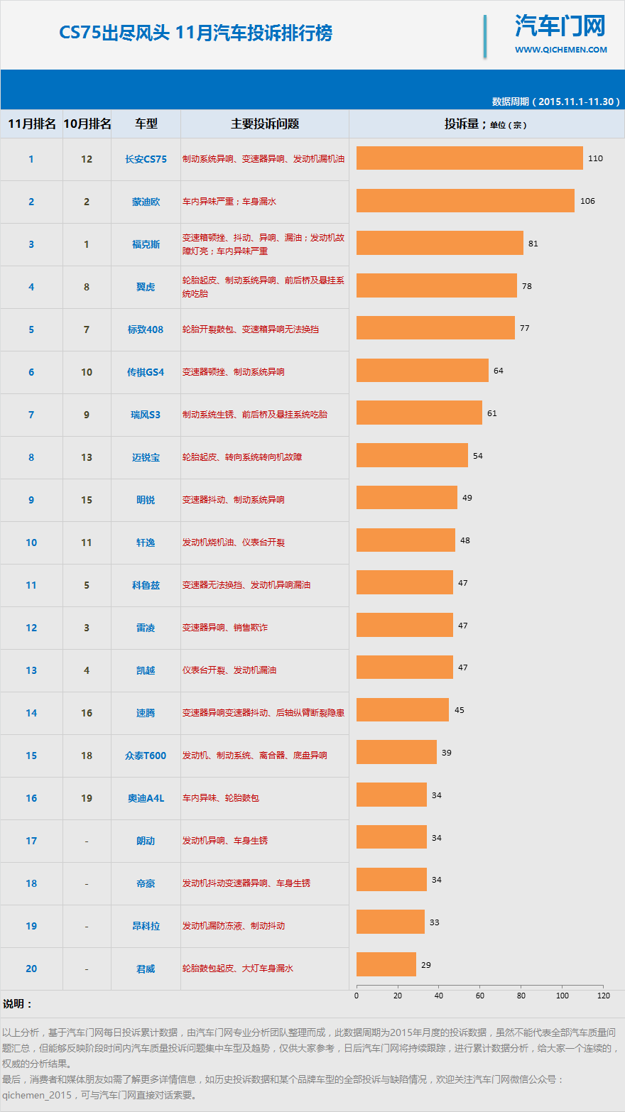 2015年11月份汽車門網(wǎng)共收到汽車質(zhì)量投訴2835宗,其中TOP20車型投訴量1117宗,約占總體的39.4%;本月,CS75伴隨著銷量的大幅提升,問題開始顯現(xiàn),投訴制動(dòng)動(dòng)系統(tǒng)、變速箱異響、發(fā)動(dòng)機(jī)漏機(jī)油等大幅增加,以110宗投訴量位于第一位,;第二、三、四名車型依然是長安福特車型,福克斯的變速箱異響、蒙迪歐的異味、翼虎輪胎起皮、吃胎等問題投訴依然不斷;標(biāo)致408以77宗投訴位居第五,主要以輪胎開裂鼓包、變速箱異響無法換擋為主;另外、朗動(dòng)、帝豪、昂科拉、君威等車型投訴進(jìn)入前20,投訴的質(zhì)量問題主要涉及發(fā)動(dòng)機(jī)異響、車身生銹及密封性不好為主。