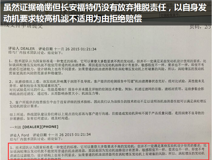 同樣的車輛同樣的問題,手握國家權(quán)威部門出具的鑒定報(bào)告,并沒有讓車主得到應(yīng)有的賠償,長安福特也沒有停止他們對(duì)責(zé)任的推脫。1126日,距車輛出現(xiàn)問題已經(jīng)過去近兩個(gè)月,車主終于等來了福特廠商的第二次回復(fù)。廠商回復(fù)認(rèn)為,因客戶在外保養(yǎng),雖然鑒定了機(jī)濾,但機(jī)濾的具體參數(shù)并沒有提供只是寫到功能正常,因?yàn)楦L氐陌l(fā)動(dòng)機(jī)要求比較高,所以所換機(jī)濾不適合我們這個(gè)發(fā)動(dòng)機(jī)所以拒絕賠償。