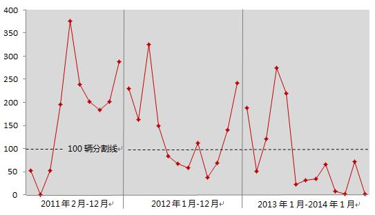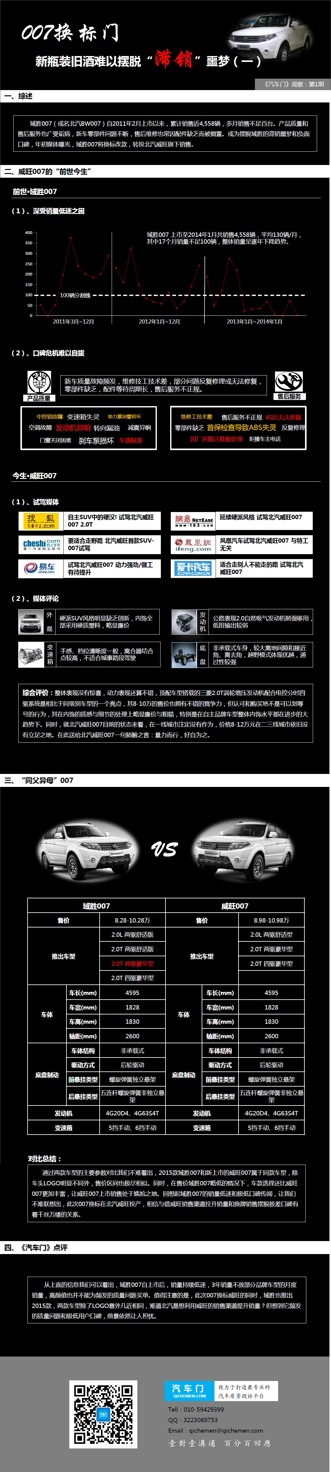 ????? 說起威旺007的前世就不得不提域勝007,域勝007自2011年上市以來就深受銷量低迷之困,自2011年2月上市之日起至2014年1月共銷售4,558輛,平均單月銷量130臺,其中17個月銷量不足100輛,且整體銷量呈逐年下降趨勢。