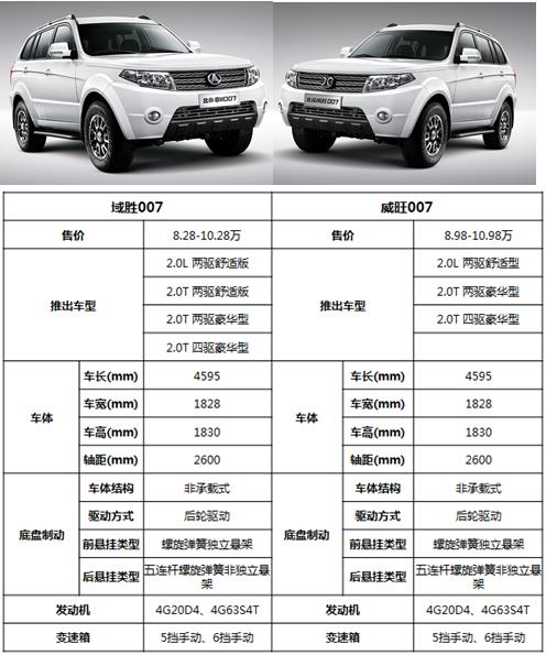 近日,北汽威旺首款SUV威旺007在其網(wǎng)上商城上市銷售,說起007相信很多消費者并不陌生,因為其前身正是它同父異母的兄弟域勝007(又稱BW007)??梢哉f北汽威旺007正是域勝007的換牌銷售車型,稱它們是兄弟倒不如說是雙胞胎。兩款車型不論外形還是配置均相同,唯一區(qū)分的標(biāo)識也就車頭的LOGO了,到底是什么原因逼迫007不得不換牌銷售,請跟隨小編刨根問底細細研究。