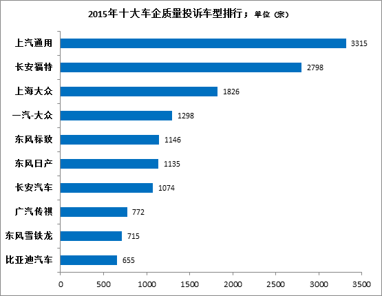 2015年汽車門網(wǎng)共收到真實汽車質量投訴25,460宗,其中前十大車企共計14,734宗,約占整體投訴的58%;前十大車企投訴中,合資車企占據(jù)七席,自主占據(jù)三席,上汽通用名列前茅,旗下別克和雪佛蘭品牌車型投訴較多,長安福特位列第二位,旗下蒙迪歐、福克斯、翼虎等車型投訴量多月位于細分市場首位,南北大眾分別占據(jù)三四位的位置;十大車企投訴中,上榜的三大自主車企分別是長安汽車、廣汽傳祺和比亞迪汽車。