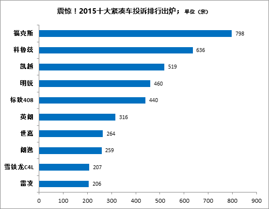 2015年汽車門網(wǎng)共收到緊湊車質(zhì)量投訴9,448宗,其中前十名共計(jì)4,105宗,約占整體投訴的43.5%;長(zhǎng)安福特??怂挂?/span>798宗投訴繼續(xù)穩(wěn)居榜首;雪佛蘭科魯茲以636宗投訴位于第二名,主要的投訴問題變速器無(wú)法換擋、發(fā)動(dòng)機(jī)異響漏油等問題;而上汽通用別克凱越與斯柯達(dá)明銳分別以519宗、460宗位于第三名和第四名。