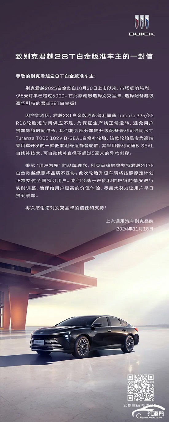 日前,別克官方發(fā)布致君越28T白金版準(zhǔn)車主的一封信,表示該車原配輪胎因產(chǎn)能不足,為了避免用戶提車等待時(shí)間過(guò)長(zhǎng),將為部分車輛升級(jí)為同品牌、同尺寸自修補(bǔ)輪胎。作為參考,2025款別克君越共推出2款車型,限時(shí)一口價(jià)售價(jià)區(qū)間為15.99-18.99萬(wàn)元。