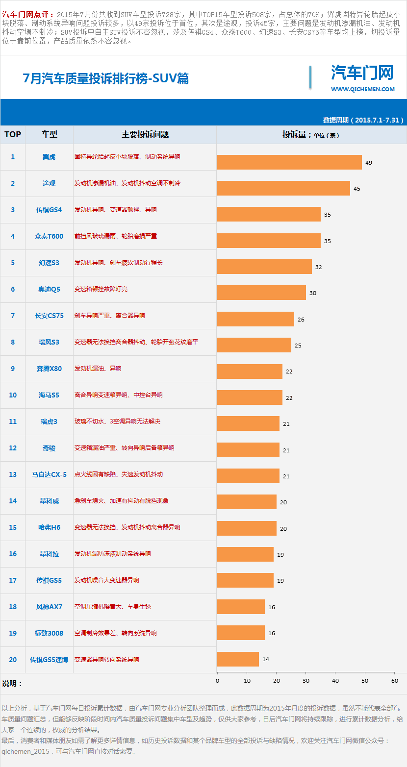 汽車門網(wǎng)點(diǎn)評:20157月份共收到SUV車型投訴728宗,其中TOP15車型投訴508宗,占總體的70%;翼虎固特異輪胎起皮小塊脫落、制動系統(tǒng)異響問題投訴較多,以49宗投訴位于首位,其次是途觀,投訴45宗,主要問題是發(fā)動機(jī)滲漏機(jī)油、發(fā)動機(jī)抖動空調(diào)不制冷;SUV投訴中自主SUV投訴不容忽視,涉及傳祺GS4、眾泰T600、幻速S3、長安CS75等車型均上榜,切投訴量位于靠前位置,產(chǎn)品質(zhì)量依然不容忽視。