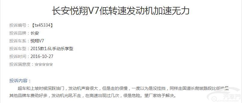 據(jù)汽車(chē)門(mén)網(wǎng)統(tǒng)計(jì),2016年全年共收到悅翔V7產(chǎn)品質(zhì)量投訴高達(dá)900余宗,主要投訴內(nèi)容圍繞發(fā)動(dòng)機(jī)功率不足和發(fā)動(dòng)機(jī)異響聲音大等展開(kāi)。