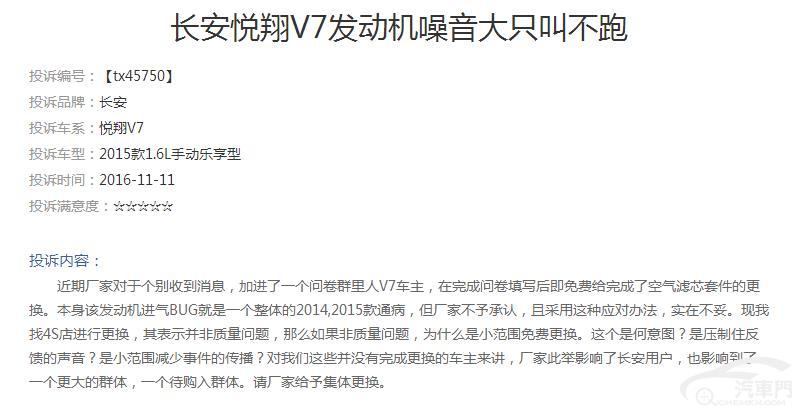 長(zhǎng)安悅翔V7發(fā)動(dòng)機(jī)異響無(wú)力問(wèn)題在2016年集中爆發(fā),投訴占比高達(dá)63%,其中10月份投訴量達(dá)到頂峰。由于涉及車(chē)型眾多,引起了廠商的重視,并承認(rèn)這一原因是由于空濾總成故障所致,且在新車(chē)型上已進(jìn)行趕緊升級(jí),但針對(duì)老車(chē)型存在的質(zhì)量問(wèn)題忽略不管,引發(fā)消費(fèi)者不滿。
