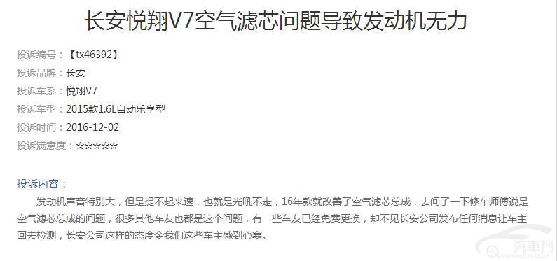 車(chē)主林先生投訴表示:發(fā)動(dòng)機(jī)聲音特別大,但是提不起來(lái)速,也就是光吼不走,16年款就改善了空氣濾芯總成,去問(wèn)了一下修車(chē)師傅說(shuō)是空氣濾芯總成的問(wèn)題,很多其他車(chē)友也都是這個(gè)問(wèn)題,有一些車(chē)友已經(jīng)免費(fèi)更換,卻不見(jiàn)長(zhǎng)安公司發(fā)布任何消息讓車(chē)主回去檢測(cè),長(zhǎng)安公司這樣的態(tài)度令我們這些車(chē)主感到心寒。?