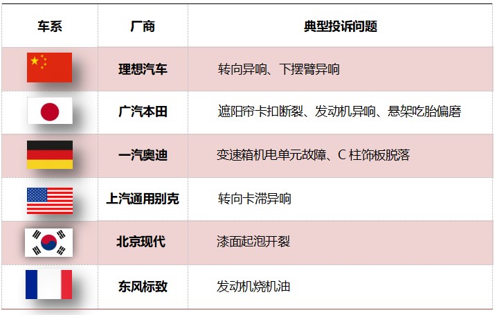 9月份,理想汽車的投訴聲量大幅下降,但仍是投訴集中度最高的中國品牌,L系列投訴集中度仍然很高。廣汽本田依然是日系車的重點(diǎn)投訴對(duì)象。皓影遮陽簾卡扣斷裂、飛度發(fā)動(dòng)機(jī)異響、雅閣懸架吃胎偏磨都是車主的“心病”。奧迪是德系車投訴問題的重點(diǎn)對(duì)象,變速箱機(jī)電單元故障和C柱外飾板脫落問題都較為集中。美系車代表是上汽通用別克,英朗轉(zhuǎn)向卡滯異響再次抬頭。