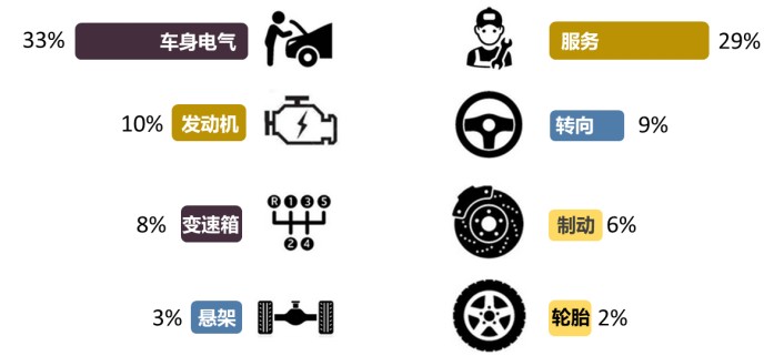 六、從投訴問題分布來看,車身電氣、服務(wù)、發(fā)動(dòng)機(jī)和變速箱仍是主要投訴問題。車身電氣類投訴排名第一,投訴份額比上月提高一個(gè)百分點(diǎn)至34%。邁銳寶XL高位剎車燈斷裂、阿維塔07沒有雨刷器、MG4缺少配置等小規(guī)模集中投訴推高了9月份車身電氣問題的投訴指數(shù)。服務(wù)類問題仍排第二,但投訴占比達(dá)進(jìn)一步上升至32%。阿維塔07停產(chǎn)、深藍(lán)S09變相降價(jià)、風(fēng)云A9L不交車以及長安UNI-K等車型車機(jī)不升級(jí)等問題遭遇集中投訴合力提高了服務(wù)類問題的投訴占比。發(fā)動(dòng)機(jī)和變速箱繼續(xù)排在三四位,投訴占比基本與上月接近。