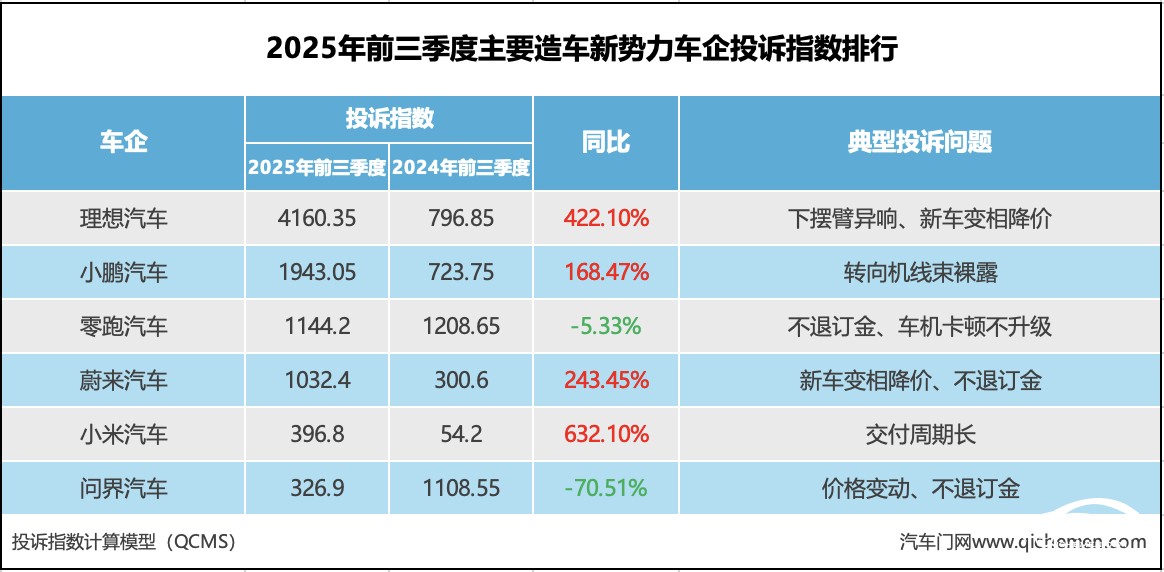 總體來(lái)看,六大主要造車(chē)新勢(shì)力車(chē)企2025年前三季度整體的投訴指數(shù)呈現(xiàn)顯著增長(zhǎng)趨勢(shì)。其中“蔚小理”接連登上了投訴榜單,與去年同期相比,這些車(chē)企在銷(xiāo)量提升的同時(shí)也伴隨著多重品控問(wèn)題的暴露,因此他們的投訴指數(shù)激增,從而大幅提升了今年前三季度主要造車(chē)新勢(shì)力的整體投訴指數(shù)。