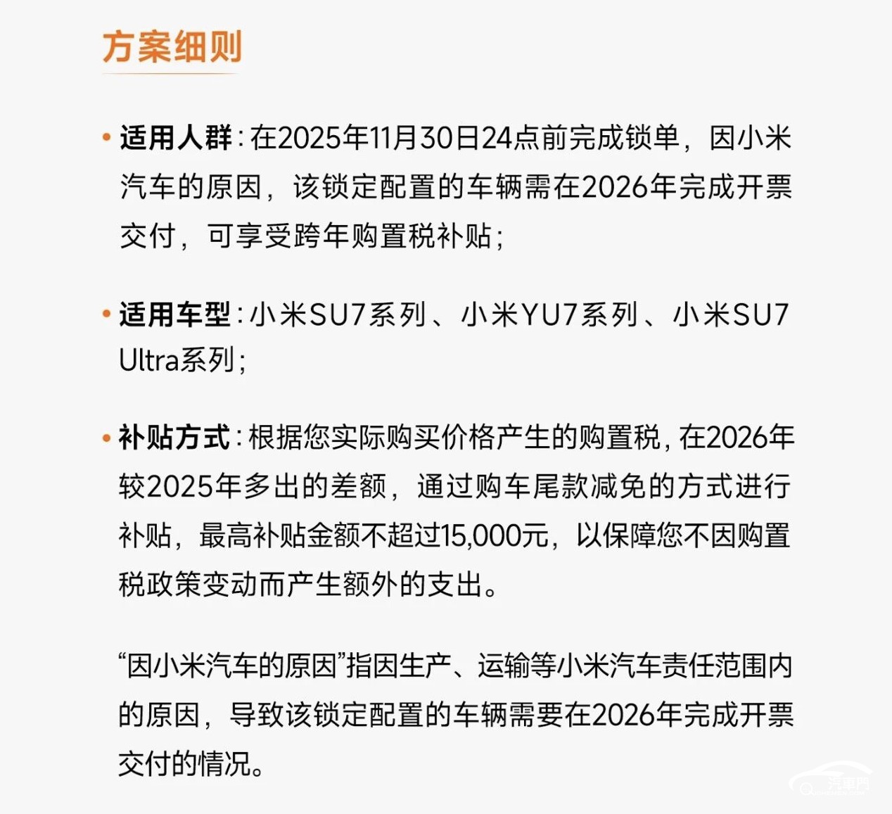 三天前的10月24日,小米汽車官方發(fā)布跨年購置稅補(bǔ)貼方案。該方案稱小米汽車官方將為在2025年11月30日24點(diǎn)前完成鎖單,因小米汽車原因,導(dǎo)致鎖單車輛需在2026年完成開票交付的,可享受跨年購置稅補(bǔ)貼。該方案適用車型為小米SU7系列、小米YU7系列、小米SU7 Ultra系列。
