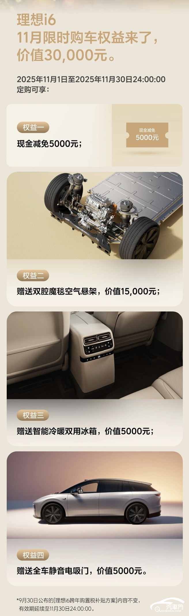 權(quán)益內(nèi)容具體包括,理想汽車官方將對在2025年11月1日到2025年11月30日24:00:00定購理想i6的車主,提供現(xiàn)金減免5000元、贈(zèng)送智能冷暖雙用冰箱、全車靜音電吸門、雙槍魔毯空氣懸架四項(xiàng)限時(shí)購車權(quán)益。該權(quán)益還補(bǔ)充到:理想i6的跨年購置稅補(bǔ)貼方案內(nèi)容不變。