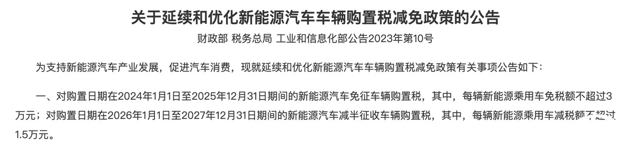 2023年6月19日,我國工業(yè)和信息化部、財(cái)政部和稅務(wù)總局發(fā)布公告稱,對購置日期在2024年1月1日至2025年12月31日期間的新能源汽車免征車輛購置稅,其中,每輛新能源乘用車免稅額不超過3萬元;對購置日期在2026年1月1日至2027年12月31日期間的新能源汽車減半征收車輛購置稅,其中,每輛新能源乘用車減稅額不超過1.5萬元。