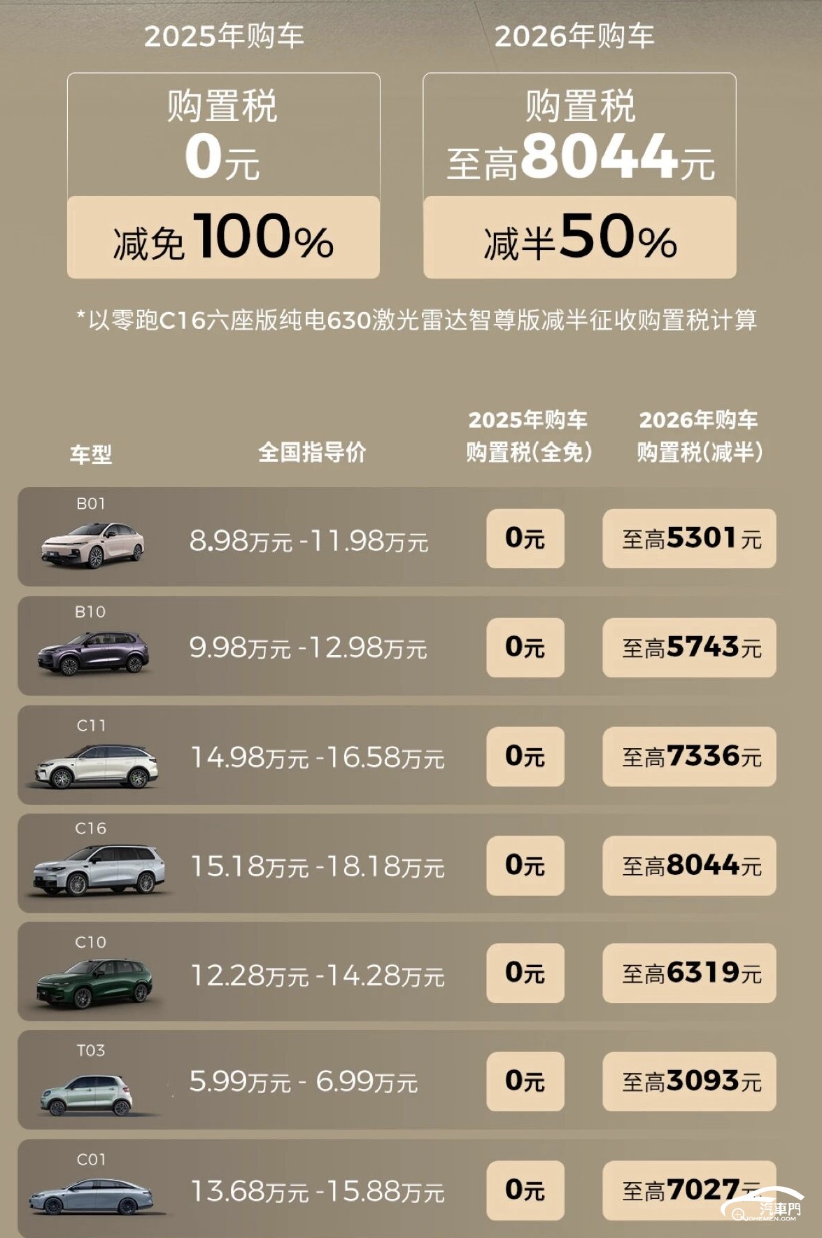 同為造車新勢力的零跑汽車早在9月21日就發(fā)布了2025年與2026年零跑汽車的購置稅對比。零跑汽車官方針對零跑汽車旗下車型的購置稅做出詳細(xì)說明,2025年購車可享受購置稅全免政策,零跑汽車還標(biāo)明了2026年購車,其旗下不同車型減半的購置稅。以零跑C16六座版純電630激光雷達(dá)智尊版減半征收購置稅計(jì)算為例,購置稅最高可免除8044元。