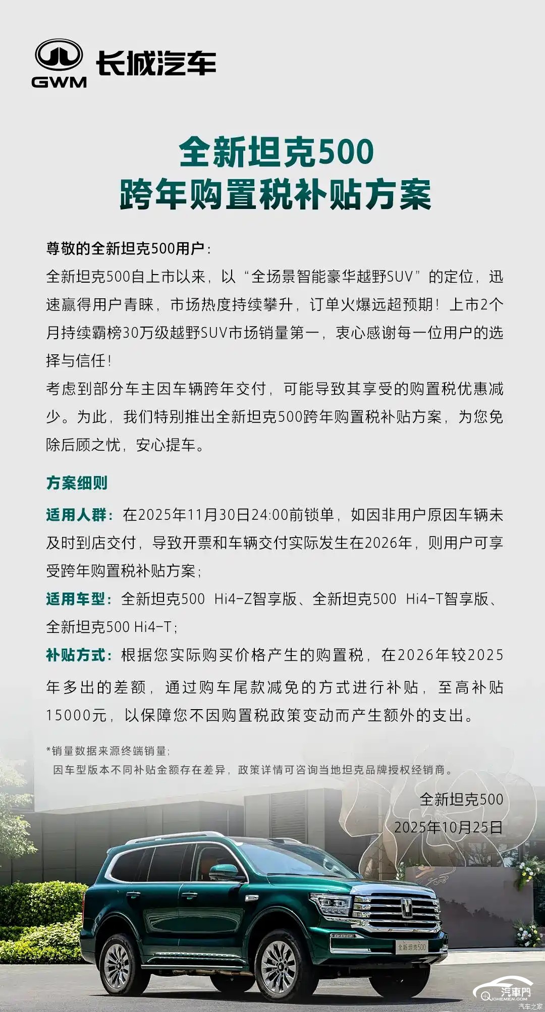 隨后國產(chǎn)品牌也陸續(xù)頒布優(yōu)惠方案。10月25日,長城汽車宣布為2026 款坦克 500 車系旗下的新款坦克 500 Hi4-Z 智享版、新款坦克 500 Hi4-T 智享版、新款坦克 500 Hi4-T 車型推出“跨年購置稅補(bǔ)貼方案”。