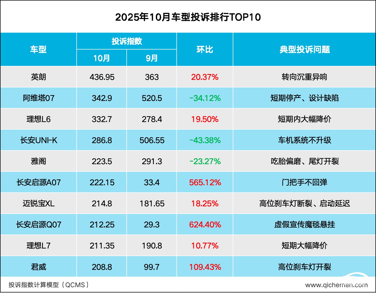 近日,汽車門網(wǎng)發(fā)布2025年10月車型投訴指數(shù)榜單。隨著汽車市場競爭的加劇,不少車企開始通過加快新車更新頻率和推出各種優(yōu)惠補貼,提升產(chǎn)品的競爭力,但這也引發(fā)了一系列問題。例如新車的短期換代和增配降價讓老車主憤怒不已,阿維塔07、理想L6、理想L7均因該問題上榜。除此之外,產(chǎn)品通病仍是榜單中的投訴主流,英朗、長安UNI-K、雅閣、邁銳寶XL就因為這樣那樣的質(zhì)量頑疾成為投訴榜單的常客。