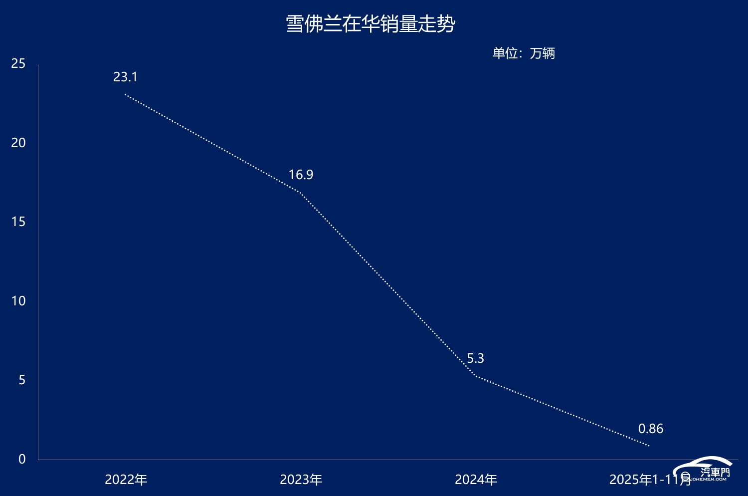 過去幾年來,雪佛蘭品牌中國市場銷量連續(xù)斷崖式下滑,單月銷量從5萬輛一路下跌至2024年的5千輛。2025年前11個月,雪佛蘭累計只賣了8000余輛。