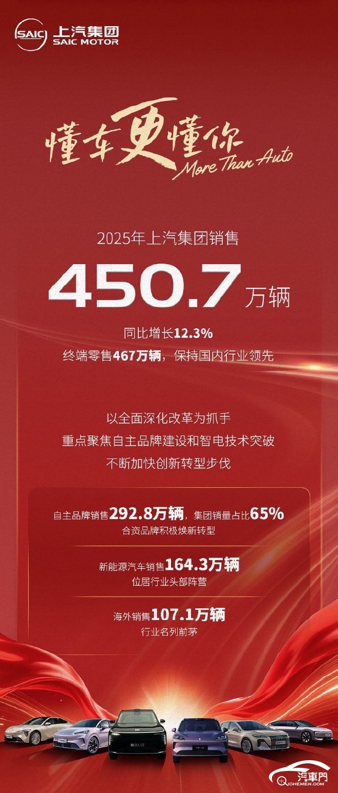 日前,上汽集團(tuán)公布2025年銷(xiāo)量數(shù)據(jù),2025年上汽集團(tuán)共銷(xiāo)售新車(chē)450.7萬(wàn)輛,同比增長(zhǎng)12.3%。終端零售銷(xiāo)量達(dá)到467萬(wàn)輛。