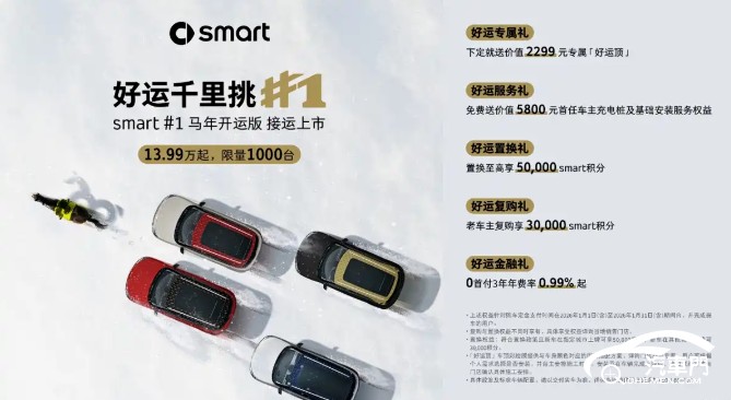 日前,我們從官方獲悉,smart精靈#1馬年開運版正式上市,新車售價13.99萬起,限量發(fā)售1000臺。購買新車可享專屬“好運頂”、免費充電樁及基礎(chǔ)安裝服務、置換及復購積分贈送、0首付及低利率等五重福利。此外,官方預告將會在2026年正式推出smart精靈#2和smart精靈#6兩款新車。