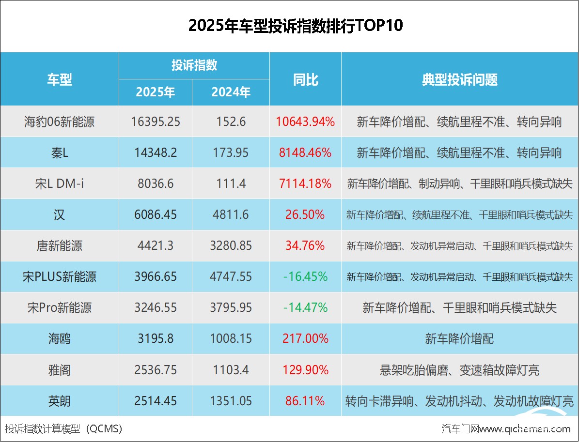 汽車質(zhì)量投訴點(diǎn)評(píng):2025年,海豹06新能源的投訴指數(shù)高達(dá)16395.25,同比暴漲106倍。這背后,新車降價(jià)增配貢獻(xiàn)了大部分投訴量。數(shù)據(jù)顯示:該問題投訴指數(shù)達(dá)到了13773.5,占比高達(dá)84%。海豹06新能源上市不到一年,官方便推出了智駕版新車型,且新款在同等價(jià)格下配置顯著提升,引發(fā)了大量老車主的不滿,迅速推高了海豹06新能源的投訴。此外,續(xù)航里程不準(zhǔn)和轉(zhuǎn)向異響的問題也飽受車主詬病。