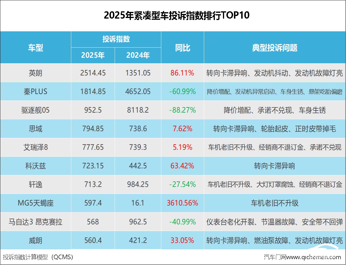2025年度緊湊型車(chē)投訴指數(shù)排行:兩車(chē)企多車(chē)痼疾難消