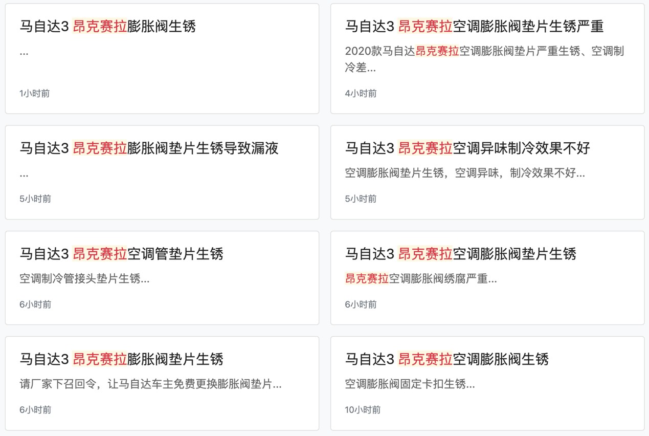 據(jù)悉,今年1月10日,一位該車型車主在修車后,將空調(diào)膨脹閥生銹問(wèn)題發(fā)布至網(wǎng)絡(luò)。此舉引發(fā)眾多長(zhǎng)安馬自達(dá)3 昂克賽拉車主關(guān)注,車主們紛紛發(fā)現(xiàn)自家車也出現(xiàn)了該問(wèn)題。
