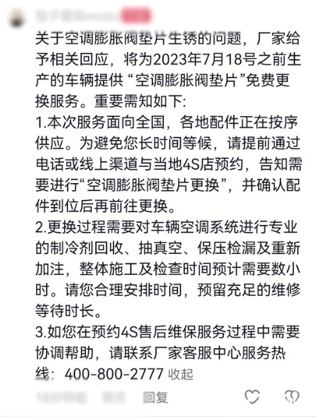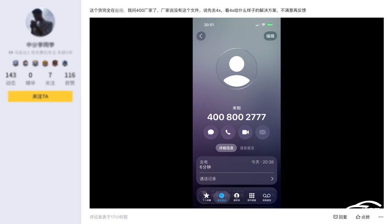 一位網(wǎng)友回復(fù)稱,小道消息不是官方公告,并不可信。另一位網(wǎng)友撥打廠家服務(wù)熱線詢問(wèn)。廠家稱沒(méi)有此文件,其建議車主先去4S店解決問(wèn)題,若車主不滿意再反饋。