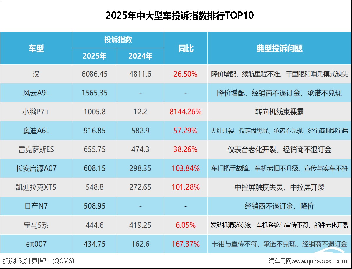 數(shù)據(jù)顯示:2025年度中大型車投訴指數(shù)達(dá)到了17461.3,同比上漲了68%。從投訴榜單來看,前十名中大型車的投訴指數(shù)悉數(shù)出現(xiàn)了同比上漲。這其中,小鵬P7+的投訴指數(shù)同比漲超81倍,空降榜單第三名。長(zhǎng)安啟源A07、凱迪拉克XTS、eπ007的投訴指數(shù)亦有明顯漲幅,翻了一倍有余。值得一提的是,去年上市的兩款新車風(fēng)云A9L和日產(chǎn)N7也登上了投訴榜單,分列榜單第二、八名。