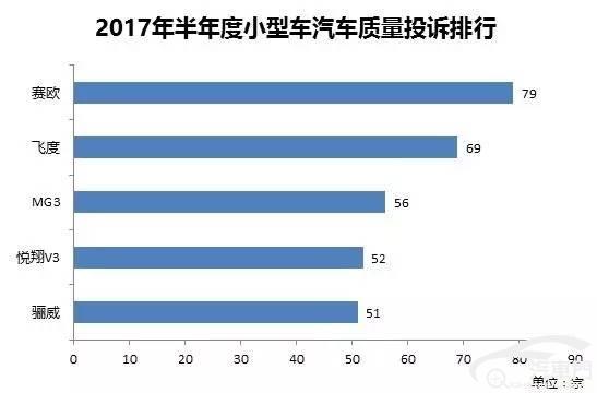2017年上半年汽車門網(wǎng)共收到小型車汽車質量投訴766宗,其中前五名共計307宗,約占整體投訴的40%;雪佛蘭賽歐變速箱異響和發(fā)動機漏油問題投訴量最高,排名首位;第二名廣汽本田飛度,轉向異響問題為投訴熱點;第三名上汽MG3,發(fā)動機正時鏈條問題投訴量較多。