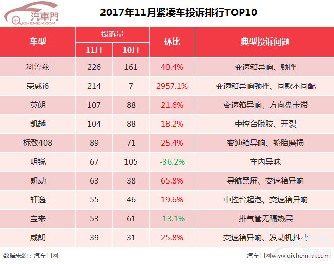 2017年11月汽車門網(wǎng)共收到緊湊車質(zhì)量投訴1,629宗,其中前十名共計(jì)1,017宗,約占整體投訴的62%??启斊澙^續(xù)蟬聯(lián)首位,除變速箱度頓挫、異響問(wèn)題外,又新增方向盤鎖死問(wèn)題;榮威I6升至第二位,變速箱異響頓挫、同款不同配為題在本月集中爆發(fā);第三名為別克英朗,方向盤卡滯問(wèn)題為本月新增投訴熱點(diǎn)。